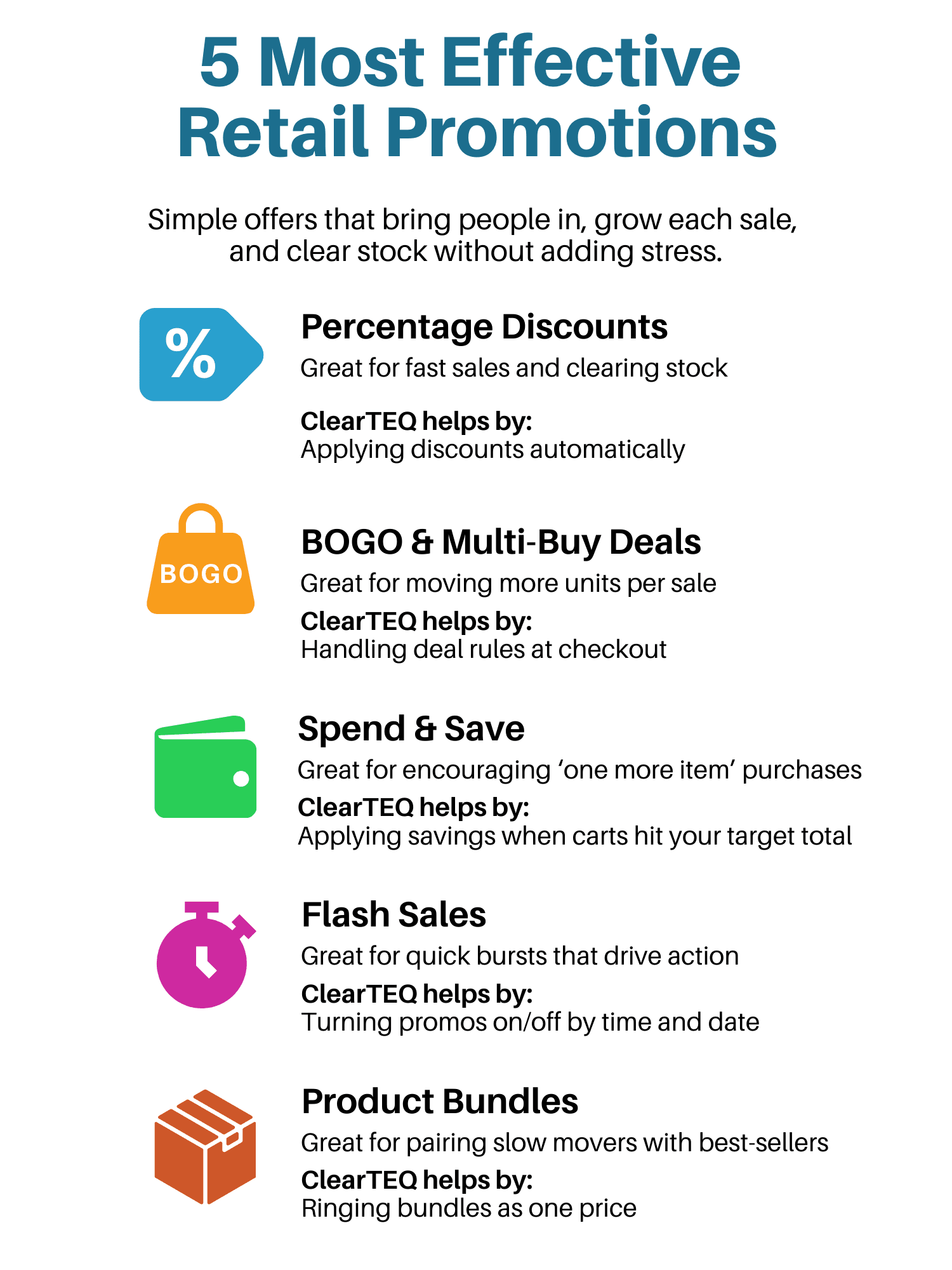 If you’re looking for a POS that makes promotions easy to set up, accurate at checkout, and effortless for your team, ClearTEQ is built for exactly that. Let us help you turn every retail promotion into a smoother, more profitable part of your day.